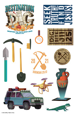 Use VBS 2021 Theme Stickers to transform ordinary items like water bottles, laptops, and notepads. These stickers are affordable enough to use during crafts and to send home as favors for your kids.VBS 2021 Theme Stickers (Pkg. of 10 Sheets) ·Contains 10 sheets of stickers ·Delivered on 4" x 6" sheets ·Make great favors for kids ·Additional resources: ·VBS 2021 Logo Stickers ·VBS 2021 Theme Stickers ·VBS 2021 Sticker Name TagsLifeWay’s 2021 VBS: Destination Dig: Unearthing the Truth About Jesus takes kids to present-day Israel to become junior archaeologists and study tangible pieces of the past to learn about who Jesus is and why He came. Along the way, they will uncover the truth of Jeremiah 29:13 that God reveals Himself to us when we seek and search for Him with all our hearts.
