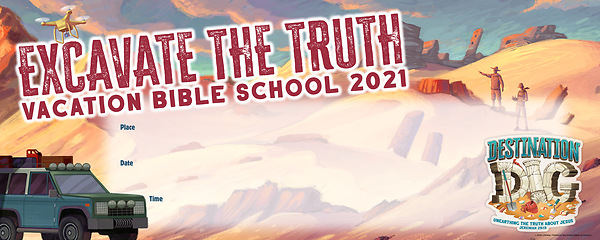 The VBS 2021 Promotional Banner is a weather-resistant, double-strength vinyl banner for curbside VBS promotion. VBS 2021 Promotional Banner ·Available in a digital format ·Weather-resistant vinyl ·35" x 87" ·Includes metal grommets in the corners ·Allows for customization to write in your VBS information ·Additional resources: ·VBS 2021 Door Hanger ·VBS 2021 Wall Art ·VBS 2021 String FlagsLifeWay’s 2021 VBS: Destination Dig: Unearthing the Truth About Jesus takes kids to present-day Israel to become junior archaeologists and study tangible pieces of the past to learn about who Jesus is and why He came. Along the way, they will uncover the truth of Jeremiah 29:13 that God reveals Himself to us when we seek and search for Him with all our hearts.