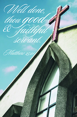 This Broadman bulletin features a beautiful 4 color image and words from the scripture, Matthew 25: 21. This bulletin can be used for a funeral service or in a weekly worship service. A free on-line template is available at www.bhpublishing group.com. All Broadman bulletins are sold in packages of 100 bulletins.