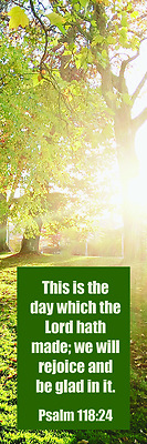 This bookmark is a great gift of encouragement. The beautiful 2" x 6 1/2" sized bookmark has a 4-color design and features the scripture from Psalm 118:24 of the KJV. The package is 25 identical bookmarks is shrink-wrapped.