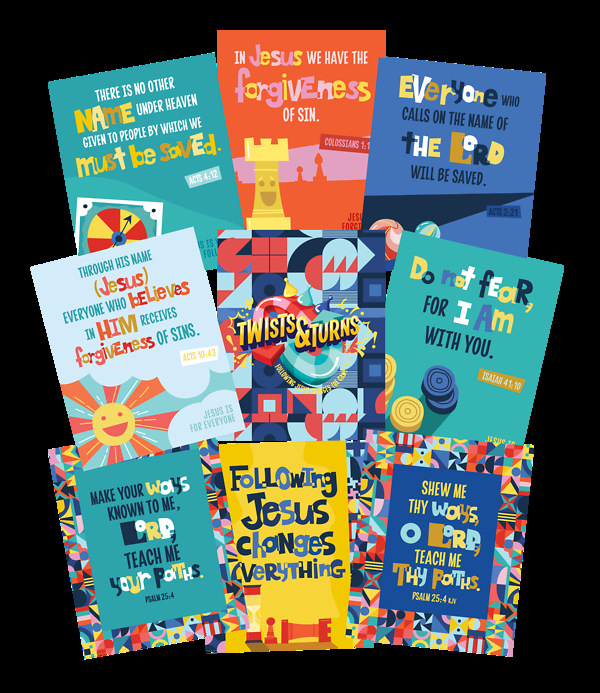 Visual Pack Pkg. 8 includes posters that are perfect for decorating classrooms, hallways, and Worship Rally. Includes directions for mounting on foamboard. Packaged without folds.VBS 2023 Visual Pack Pkg. 8 includes: ·Twists & Turns Logo Poster ·VBS 2023 Scripture Poster (CSB and KJV ) ·VBS 2023 Motto Poster ·5 Bible Study Posters with daily Scripture focus ·Dimensions: 32"" x 40"" ·Available in a digital format ·Additional resources: ·VBS 2023 Giant Inflatible Game Cube ·VBS 2023 Whirleys ·VBS 2023 Rotation SignsTwists and Turns VBS is a fantastical celebration of how following Jesus changes the game. Spin the spinner, beat the clock, skip ahead, level up, and play to win! Kids will have fun with games while learning that Jesus guides us through all the twists and turns of our lives. In the end, they'll find that even when they mess up it is never "game over."