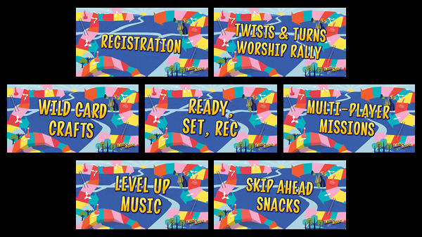 Help kids, parents, and leaders navigate your VBS with VBS 2023 Rotation Signs. Signs include: ·Twists & Turns Worship Rally ·Bible Study Game Room ·Wild Card Crafts ·Level Up Music ·Multi-player Missions ·Skip Ahead Snacks ·Ready, Set, Rec ·RegistrationVBS 2023 Rotation Signs ·These signs make it easy to locate rotations and registrationAdditional resources: ·VBS 2023 Giant Inflatible Game Cube ·VBS 2023 Whirleys ·VBS 2023 Rotation SignsTwists and Turns VBS is a fantastical celebration of how following Jesus changes the game. Spin the spinner, beat the clock, skip ahead, level up, and play to win! Kids will have fun with games while learning that Jesus guides us through all the twists and turns of our lives. In the end, they'll find that even when they mess up it is never "game over."