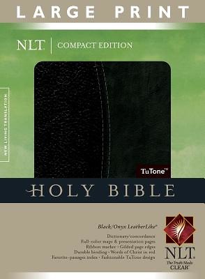 Large Print Compact Edition of the New Living Translation makes it easy for readers to carry God’s Word wherever they go. Font size is 8.75 point. Deluxe features include 8 pages of full-color maps, presentation page, silver page edges, red-letter, ribbon marker, and dictionary/concordance. This edition features an attractive black and onyx TuTone binding with thumb index.