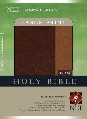 Large Print Compact Edition of the New Living Translation makes it easy for readers to carry God’s Word wherever they go. Font size is 8.75 point. Deluxe features include 8 pages of full-color maps, presentation page, silver page edges, red-letter, ribbon marker, and dictionary/concordance. This edition features an attractive brown and tan TuTone binding with thumb index.