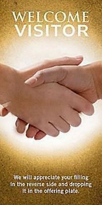 The front of this two-sided card features a full-color illustration two people shaking hands, and the words “Welcome to our service. We will appreciate your filling in the reverse side of this card and dropping it in the offering plate.”; the reverse side has space for entering the date, visitor’s name, phone number, address, if visitor is a church member and where, if visitor attends Sunday School and where, guest of?, and a box to check if the visitor is interested in joining the church. Size is 2 1/2" x 5”; package of 25, same design.