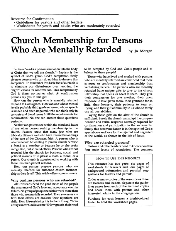 This downloadable pdf confirmation packet offers guidance for appropriate teaching methods and information on how persons with moderate mental retardation learn. The pdf includes a 4-page leaflet with practical information and suggestions for parents and leaders, and six worksheets for learners containing educational drawings and activities.