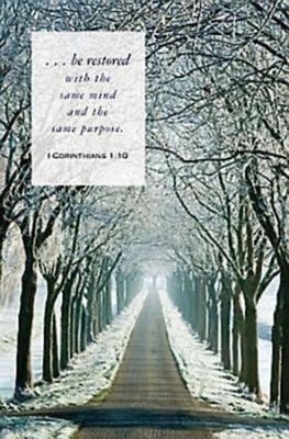 . . . be restored with the same mind and the same purpose. ~1 Corinthians 1:10. The single path in this beautiful winter scene supports the Bible verse--to be called to the same purpose. This striking bulletin can be used at any time of year to help a congregation worship and to discern God’s purpose for their lives. The bulletin is 8.5" x 11" unfolded, and 5.5" x 8.5" folded.