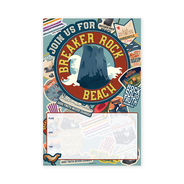 This two-sided VBS 2024 Promotional Poster features two colorful images that are large enough to read easily on wall displays. Both sides of the poster allow room for customization with your VBS dates, times, and location. (23" x 35")Additional resources: ·VBS 2024 Registration Flyer ·VBS 2024 Bulletins ·VBS 2024 Door HangersAt Breaker Rock Beach VBS, kids will be challenged as they discover that God’s truth never changes, everyone needs Jesus, and learn to speak the truth in love. Adventure awaits each day as kids explore tide pools, spot orcas, fly kites, and watch the mighty waves crash up against the immovable Breaker Rock!