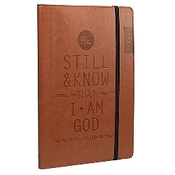 A perfect companion for writing, this super supple, tan writing journal is buttery soft in your hand. Scripture from Psalm 46:10 is artfully positioned and debossed on the front cover. The journal is covered in a quality man-made material with the look and feel of real leather (trade name LuxLeather), has a lay-flat spine and an attached elastic band closure to protect your pages.