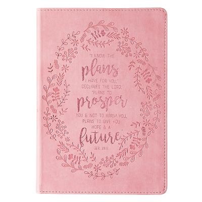 The cover is debossed with a floral leaf wreath encircling the Scripture verse from Jeremiah 29:1, "For I know the plans I have for you, declares the Lord, plans to prosper you and not to harm you, plans to give you hope and a future." The rose gold foiled title brilliantly complements the lemonade pink LuxLeather cover. Inside the journal are pre-lined pages. Scripture for meditation is printed at the bottom of each page.