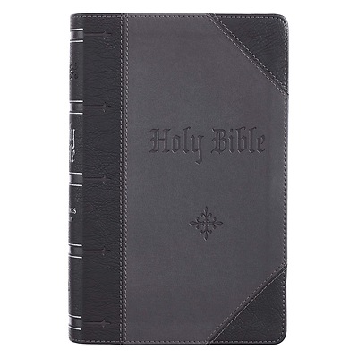 Brief Description:The classic King James Version Bible is printed in giant print and presented in a decidedly modern look in the Black Two-tone Quarter-bound Faux Leather Giant Print Bible with Thumb-index. The spine and corners of the faux leather Bible cover are wrapped in black leather-textured faux leather, and attached to the smooth gray faux leather panels of the front and back covers, by gray topstitching. Similar stitching reinforces the edges of the quarter-bound flexcover Bible. The title is heat debossed and accented by a quatrefoil fleur-de-lis design. The leather-textured black faux leather spine is decorated with silver foiled and heat debossed faux spine ribbing. The title and version reference are foiled in silver. The handsomely designed Bible features a giant 14 point-type print that is easy to read. No more eye-strain! Essential study resources include double-column formatting, a thematic Scripture verse finder, concordance, topical verse finder, the words of Christ are printed in red ink, and a one-year Bible reading plan. The lay-flat spine opens completely flat without damaging the spine. An attached black satin ribbon acts as a place holder while gilt-edged pages and a thumb-index are additional luxury features. The attractive Black Two-tone Quarter-bound Faux Leather Giant Print Bible with Thumb-index makes a meaningful gift for a son or husband on completion of their studies or career. Mark a life event with the Black Two-tone Quarter-bound Faux Leather Giant Print Bible with Thumb-index. Quarter-bound Design, Black and Gray Faux Leather Cover, Flexcover, Heat Debossed, Title and Accents, Silver Foiled SpineTitle and Accents, Classic King James Version, Thumb-indexing Tabs, Satin Ribbon Marker, Gilt-edged Pages, Double Column Format, Words of Christ in Red, Thematic Scripture Verse Finder, One-year Bible Reading Plan, Lay-flat Binding, 14 Point Type, Size: 8.9 x 5.7 x 1.7 (226 x 145 x 43mm)