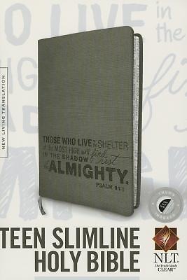 Teen Slimline Bible in the New Living Translation is now available for the first time with thumb indexing to help teens find passages quickly. The presentation page, cover design, and page edges creates an overall theme using Psalm 91:1, which encourages teens to depend on God to be their shelter when they go through difficult times or need rest. Includes a 53-page dictionary/concordance that helps teens locate passages on various topics, 8 pages of full-color maps, charcoal ribbon marker, and thumb indexing tabs.