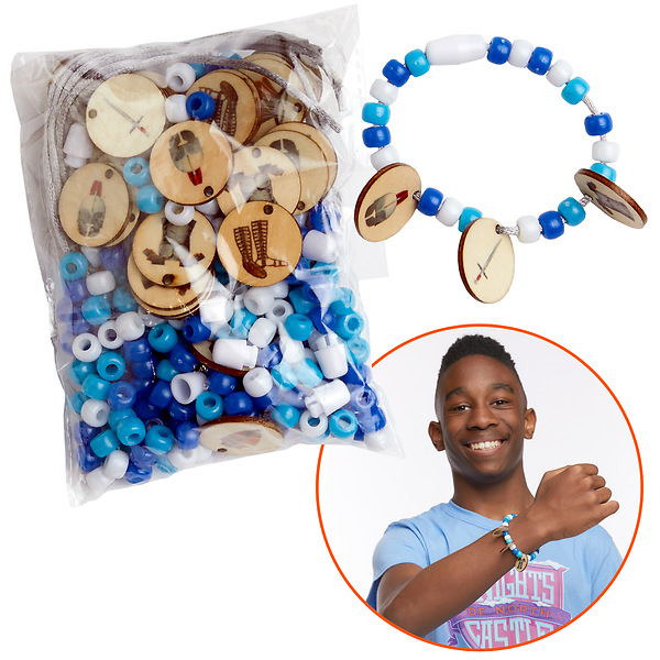 Armor of God Bracelet Kit is a fun reminder of what they learned at VBS! Kids can create their own style with the items provided. Kit includes a 9' blue satin cord, 3 wood charms with pieces of the Armor of God pictured on both sides, 20 beads per bracelet in dark blue, light blue, and white. Great for wearing, great for sharing!
