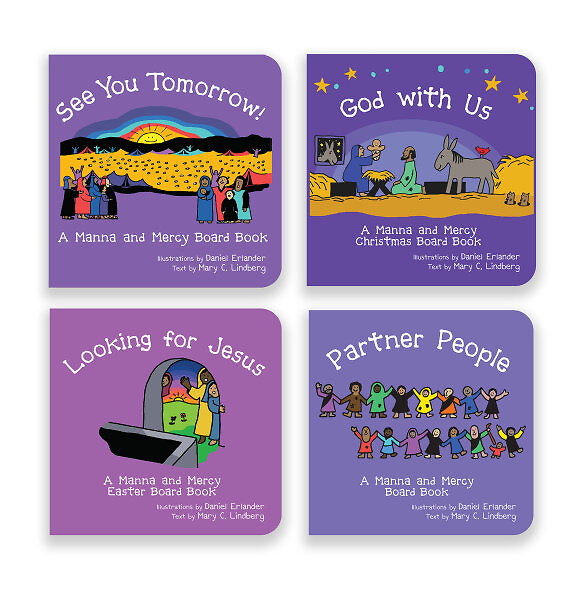 A bundle of all four board books from the Manna and Mercy collection: See You Tomorrow, God with Us, Looking for Jesus, and Partner People. Use these colorful and inviting board books to share the images and words of Daniel Erlander with young children!