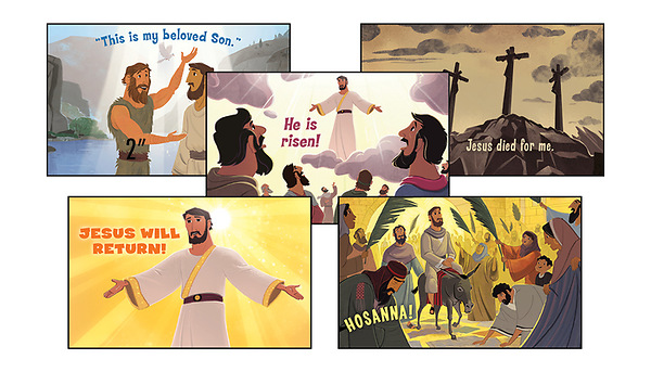 The poster pack includes 5 four-color posters that feature images from Jesus' life including His baptism, triumphal entry, crucifixion, ascension, and second coming.