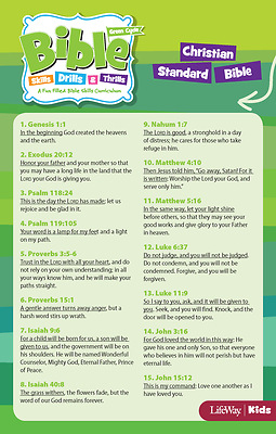 Build strong Bible skills in children by preparing them for associational and state convention Bible Drill competitions! These two-sided CSB(R) Verse Cards are a convenient reference for leaders and a great study guide for children. Designed to fit easily inside a drill Bible, each card shows all 25 Bible verses and 10 Key Passages for the current competition cycle.