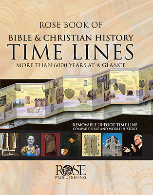 The "Rose Book of Bible & Christian History Time Lines "reveals 6000 years of history from Adam to today This 20-foot time line includes hundreds of historical facts, key people, and important dates from Bible and Christian history, alongside key events and people from world and Middle Eastern history. Called "spectacular" by one review, this fantastic resource can be read like a book or slipped out of its binding to display on a wall in a classroom or home. Includes dozens of colorful illustrations and photographs. "Hard cover: 9 1/8" x 11 1/4." Sturdy chart unfolds to 20' long." The 20-foot fold-out chart is a must-have resource for pastors, teachers, and students of the Bible. The "Rose Book of Bible & Christian History Time Lines" offers a birds-eye view of history showing Christian historical events unfolding next to their world history counterparts. It's easy to see how biblical history relates to events happening throughout the Middle East and around the world; for example: Jonah lived during the time of the first recorded Olympic games, 776 BC Mount Vesuvius erupted and buried Pompeii during the Apostle John's lifetime Plutarch the Greek historian was born AD 46, the same year that followers of Christ were first called "Christians" in Antioch The Huns invaded Europe in 360, the same year that books replaced scrolls This indispensable Bible study tool is a great addition for any church resource library, Christian school, or homeschoolers classroom. The "Rose Book of Bible & Christian History Time Lines" fold-out chart uses nine different keys to indicate these special Bible time line features: Bible Development Key Persons Bible History King of Israel King of Judah Key eventsThe Bible history timeline is divided into two eras: Genesis to Revelation: 2200 BC to AD 100 Life of Jesus to Modern Day: AD 1 to Present After the ascension of Jesus, the Bible history time line covers the expansion of Christianity The time line includes key eras such as the: Rise of the Eastern Orthodox Church and Monasticism Rise of Islam and Iconoclasm Printing Press, Spanish Inquisition, and Humanism Rise of Protestantism, Age of Exploration, and Puritanism The world and Middle Eastern history time lines presents historic people and world events, for example: The first Chinese dictionary containing 40,000 characters appears in 1717 BC King Tutankhamen begins his rule in 1360 BC Ming Dynasty begins in China 1368 United Kingdom of Great Britain formed 1707