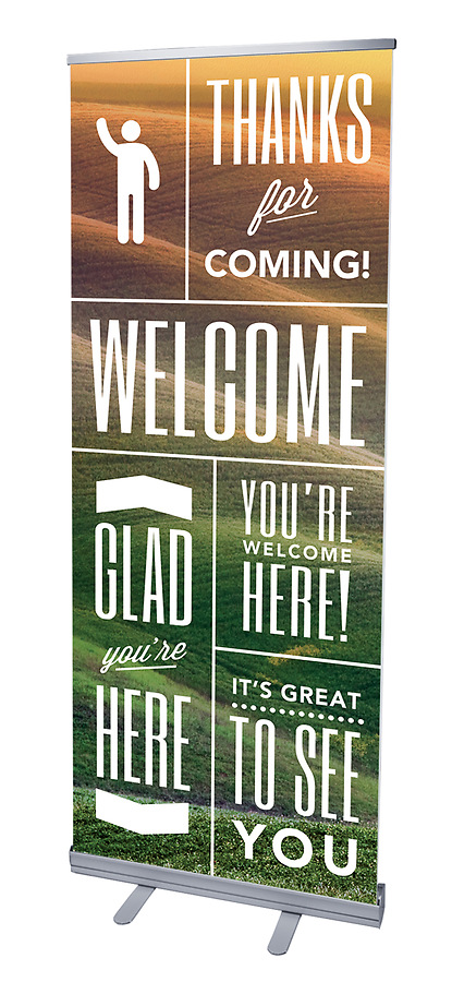 This 2' 7" x 6' 7" Roll-Up style banner with stand features attractive designs in a size that can be used almost anywhere. The height allows it to be seen above the crowd, while the small footprint allows for display in any area of your building. The 15 oz Non-Curl Vinyl used for indoor banners provides for vivid colors and eye-catching graphics even up close. One of the most versatile tools available, banners can be used in a variety of ways around your church: To invite and welcome guests, provide direction around your building, update your church’s décor and communicate your mission and vision. Also a great tool for portable churches. To clean simply wipe with a damp cloth. **typically ships in two business days after factory receipt of order**