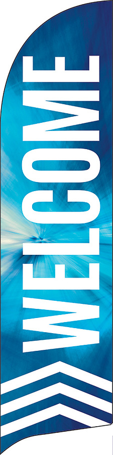 Attract passing traffic, promote your church and welcome visitors with this welcome flag banner with blue chevron design. This eye-catching banner also known as a feather flag draws attention as it moves in the slightest breeze. Display it along a busy road, along the driveway to your church or in planters in your parking area, flag banners help visitors know they have arrived and found your church building. This flag banner is printed on 130g Polyester which meets or exceed industry standards for outdoor flags. The lightweight material is designed to allow the graphic to bleed through providing a reverse image on the back side.