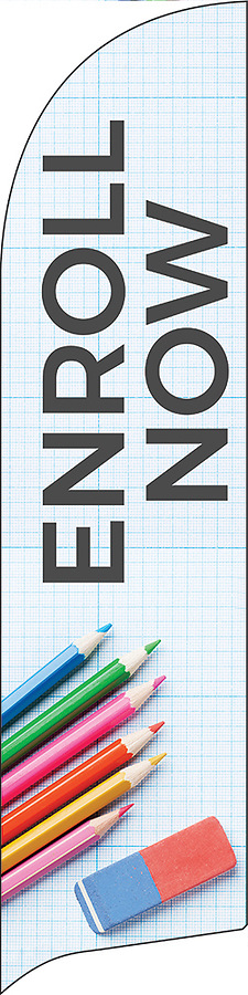Attract passing traffic, promote your church and welcome new students with this enroll now flag banner with color pencils and erasure. This eye-catching banner also known as a feather flag draws attention as it moves in the slightest breeze. Display it along a busy road, along the driveway to your church or in planters in your parking area. This flag banner is printed on 130g Polyester which meets or exceed industry standards for outdoor flags. The lightweight material is designed to allow the graphic to bleed through providing a reverse image on the back side.