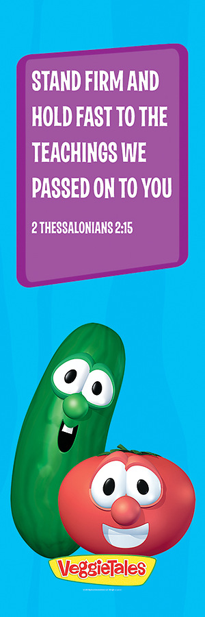 Vinyl 2' x 6' banner featuring VeggieTales characters Bob the Tomato and Larry the Cucumber. Text: Stand firm and hold fast to the teachings we passed on to you. 2 Thessalonians 2:15.