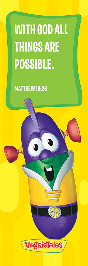 Vinyl 2' x 6' banner featuring VeggieTales character Larry the Cucumber. Text: With God all things are possible. Matthew 19:26