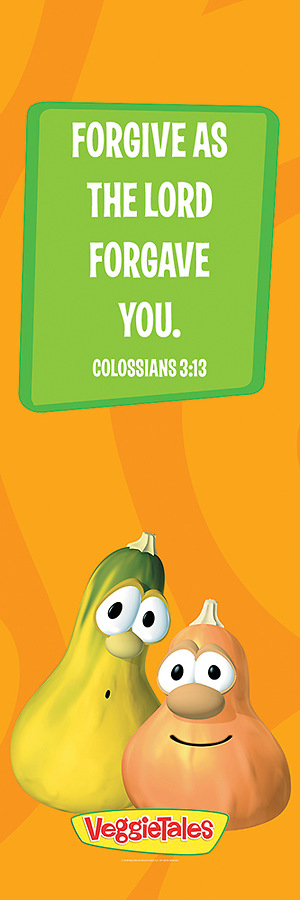 Vinyl 2' x 6' banner featuring VeggieTales characters Jimmy and Jerry Gourd. Text: Forgive as the lord forgave you. Colossians 3:13