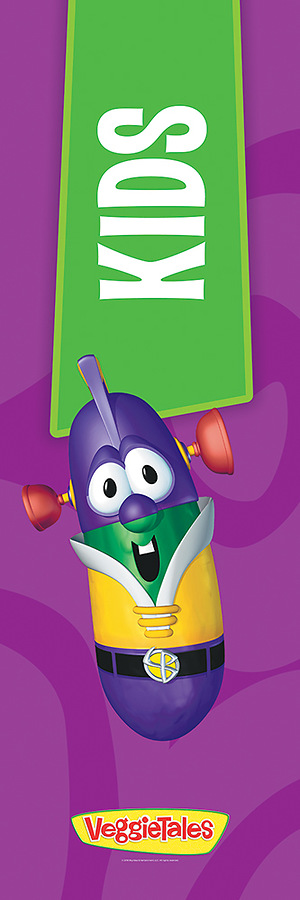 Vinyl 2' x 6' kids banner featuring VeggieTales character Larry the Cucumber.