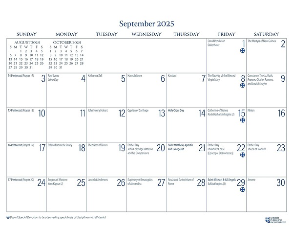 Running from September 2024 to December 2025, this large desk or wall calendar includes ample space for notes and appointments. The calendar also includes Anglican, Roman Catholic, Orthodox Christian, Islamic, Jewish, and secular holidays.