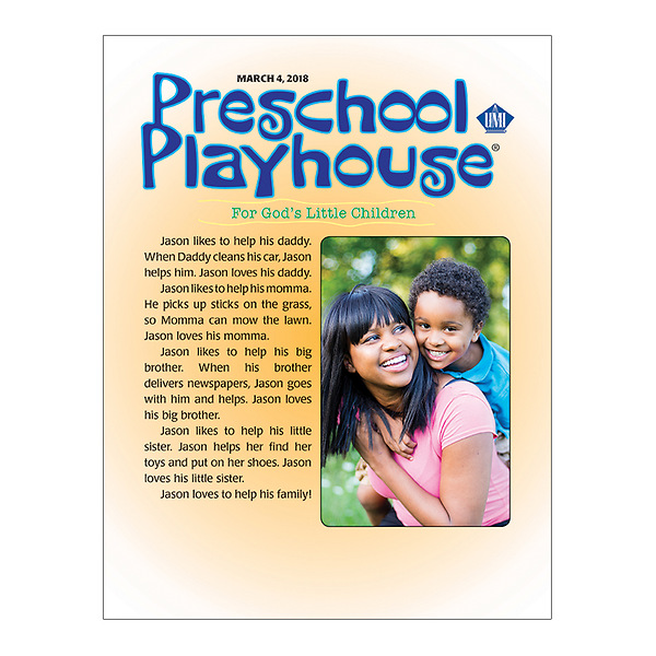 Preschool Playhouse student folders fill the open hearts and minds of youngsters ages 2-5 with a clear understanding of Jesus' role in their lives. Designed in an easy-to-use nested folder format, Preschool Playhouse includes 13 weekly lesson worksheets that offer a simple Bible story, a contemporary story, fun activities, and tips for parents to become more involved in their child’s spiritual formation. Like all UMI curriculum, Preschool Playhouse is based on the International Uniform Lesson Series.