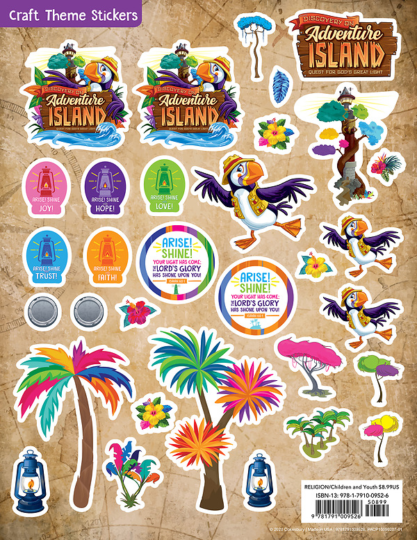 Take your crafts to a new level with the Discovery on Adventure Island stickers! Images include the logo, Theme Verse, Key Learnings, Beacon the puppet, and more! (Pkg. of 12 sheets)