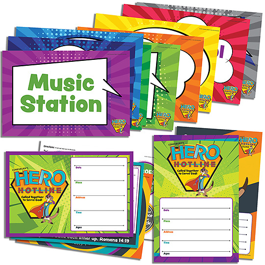 Vacation Bible School (VBS) Hero Hotline Activity Center Signs & Publicity Pak