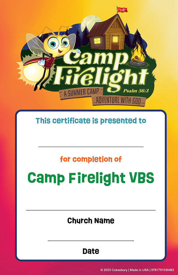 Camp Firelight logo, Camp Callout (our theme verse), as well as space to personalize with each camper’s name, church name, and date attended. The certificates are 8.5" x 5.5" and 48 per package. The certificate helps each camper celebrate the journey of trusting God and sharing the Good News of Jesus' love with family and friends!