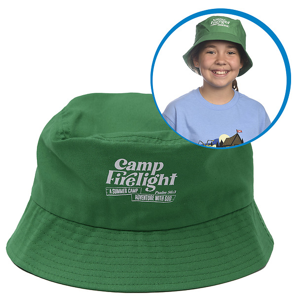 Camp Firelight VBS experience with their own Bucket Hat with logo. These cotton hats should fit a 24” head. They are green with the