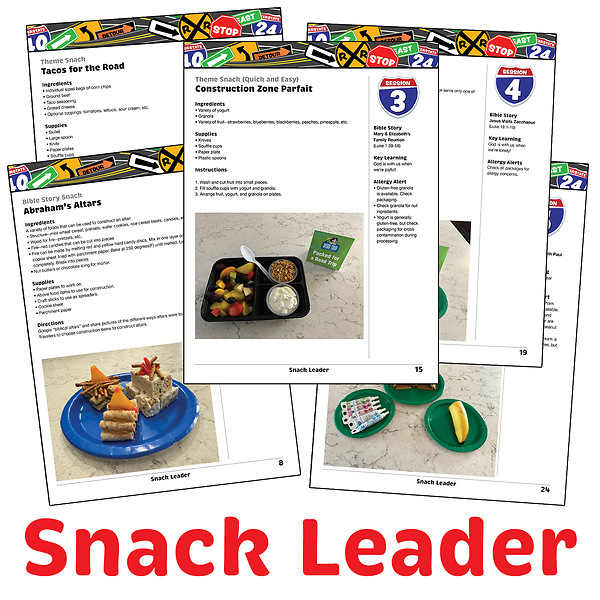 Snack Leader Guide contains snack recipes, multiple snack options, blessings, and shopping lists that make snack time easy and provide tie-ins to each session. Keep in mind the FREE snack calculator located on cokesburyvbs.com. Included in the
