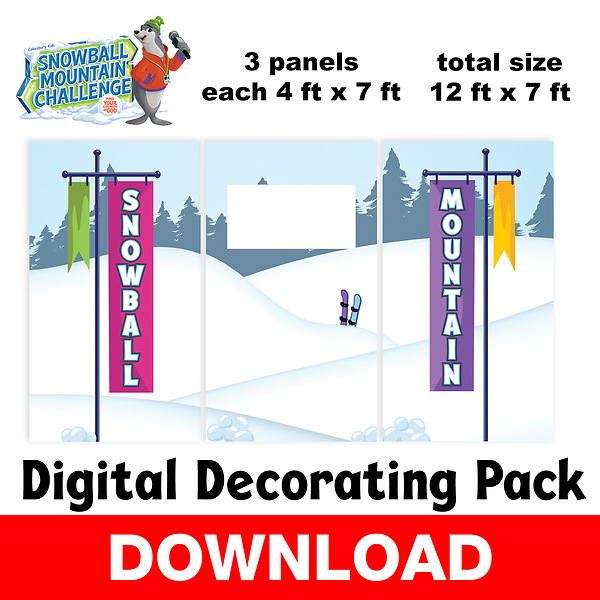 The Snowball Mountain Challenge Digital Wall Art & Puppet Stage will help you put the finishing touches at on your VBS! The pack contains large format PDF Images. With the files you can create an oversized license plate, 6' W x 4' H, for decorating your walls. Also, included are three files you can use to decorate Ollie's booth. Each panel is 4' W x 7' H and, when put together, will cover an area of 12' x 7’.