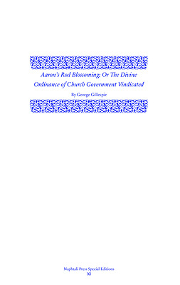 George Gillespie's first book, the anonymously published Dispute against the English Popish Ceremonies, propelled him to the forefront of the Second Reformation of the Scottish Kirk. He was then appointed to be an ecclesiastical commissioner to attend the Westminster Assembly of Divines in London. There he produced his most famous work, Aaron's Rod Blossoming, in order to refute the Erastians, who argued for church subordination to the civil government. Gillespie divides his treatise into three sections: (1) "Of the Jewish Church Government," (2) "Of the Christian Church Government," and (3) "Of Excommunication from the Church, and of Suspension from the Lord's Table."
