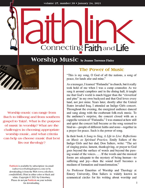 Worship music can range from Bach to Hillsong and from southern gospel to Taizé. What is the purpose of music in worship? What are the challenges in choosing appropriate worship music, and what criteria can help us choose music that best fits our theology? Next Week's Issue: Caregivers