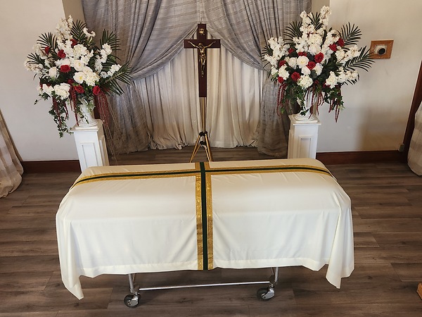 A funeral pall, reminds us of the garment given at baptism and therefore symbolizing our life in Christ, and is draped over the coffin at the beginning of the liturgy. This dignified and elegant pall is 6' X 10' with squared corners with a central panel design in green and gold made of woven lame and velveteen. The pall fabric is 80% Poly and 20% Viscose soft fabric.