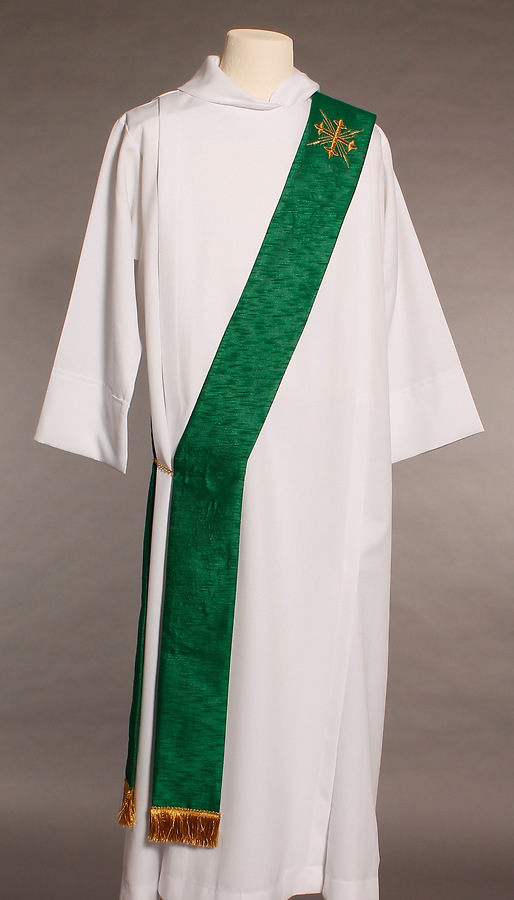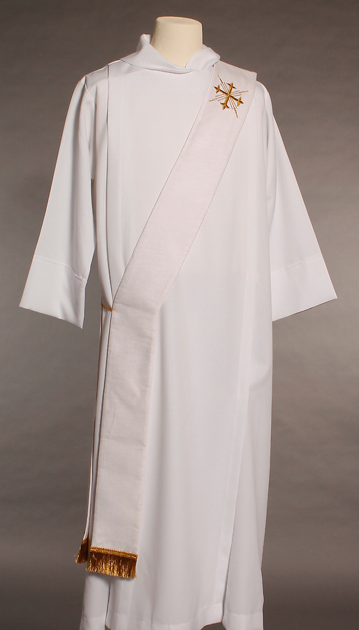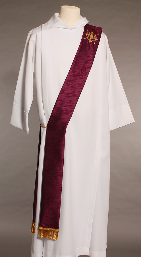 This new stole brings ornate styling previously unobtainable in this price range. Made of a Polyester/Rayon/Silk blend this stole features a duponi silk textured base fabric with a gold embroidered Greek cross on the front panel and matching gold fringe on the bottom. Approx. 52" long and 4.5” wide. Also features a 2-1/2" long gold colored chain at the hip for additional room. Dry clean only. Also available in white, green, and red.