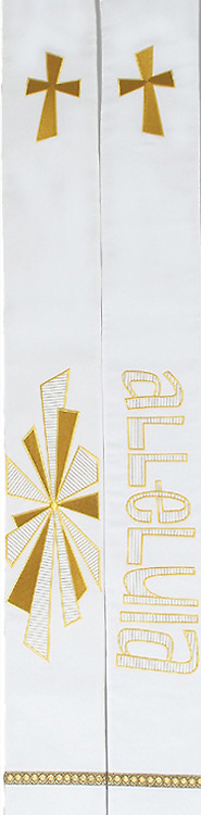 With a large stylized cross placed chest high on both sides, these stoles measure 5” x 110”. The word “Alleluia” is displayed on the wear’s left and a sunburst design is on the right with both falling knee high. The neck is contoured for comfort and to help the stole lay flat. The stole is made of White Cathedral material with colored embroidery outlined in gold metallic thread. It is lined with satin.