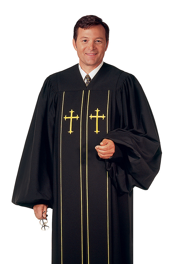 This affordably priced robe is similar to the "Cleric" robe style, but tailored in durable black Viva, accented by bright gold piping and embroidered Latin Crosses. It is available in 20 different sizes to fit men from 5'6"-6'4". It is crafted with lined belled sleeves with deep cuffs, a right pocket slit, a generously cut body with balanced machine fluting over the shoulders and across the back.