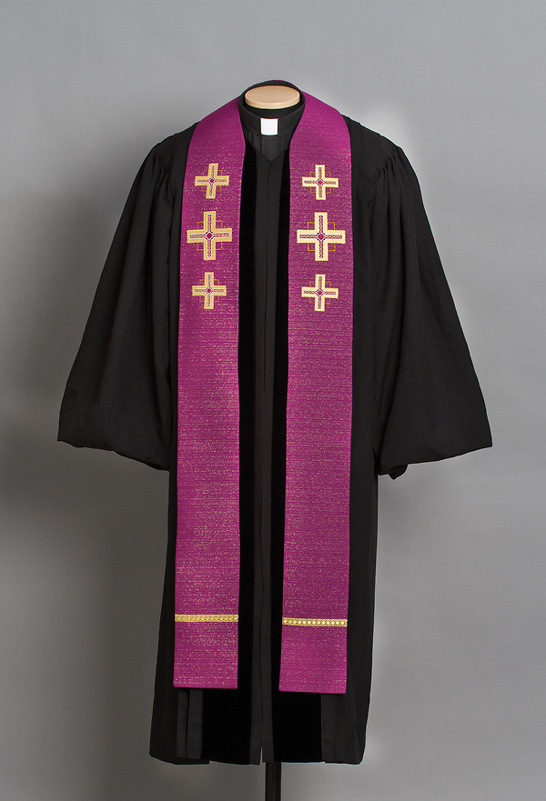 The Kingdom Cross Stole features three crosses at chest level embroidered on Luxemberg with Lurex fabric. Available in blue, white, green, purple, and red. Stole measures 5" wide x 110" long. Made in the USA.