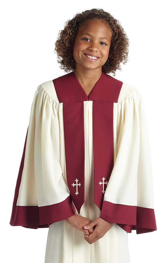 Simplicity made stylish, this classic choir robe is designed for easy comfort. Tailored in cream Wonder Crepe with maroon accents and ready to ship in 3 sizes to fit most junior choir members.