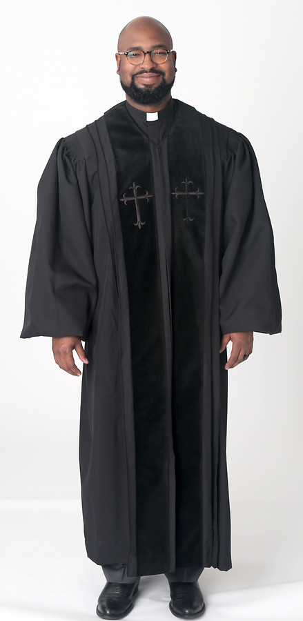Beautiful pulpit robes to be worn with distinguished pride and comfort. These robes are tailored by expert craft people to standard sizes. Medium weight Liberty 100% polyester provides for a fine drape yet comfortable in all climates. Majestically adorned with rich velveteen panels either plain or embroidered with Latin Cross. Matching cording outlines side pleats. Double lined sleeves with cuff for a bell effect sleeve. Full precision fluting across shoulder and back gives beautiful drape.