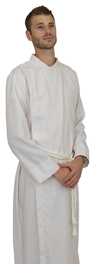 This natural flax blend alb features a crossover front with Velcro and snap closures, cuffed coat sleeves, tapered collar, full pocket on the left, and pocket slit on the right, Ecru 4-yard knotted cincture cord included. Sizes for a floor clrearnace of 4" to 6".