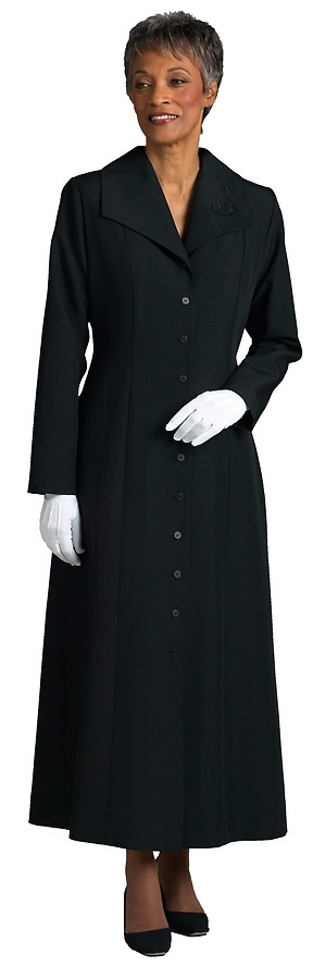 This Viva clergy dress Features a wing collar embroidered on the left side with Praying Hands. Softly pleated skirt and full length sleeves, full button front closure, and left and right pockets. Machine washable.