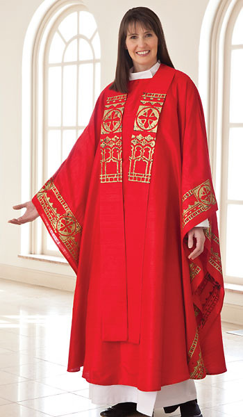 WomenSpirit's Abbey chasuble set is a glorious work of art. The image is created by a hand-carved wood block stamped on silk. They are meticulously hand stamped one at a time in Kansas City by a local fabric artist. There will be slight variations in the print on the silk. Ships in 4 to 6 weeks. Set includes chasuble and matching stole.