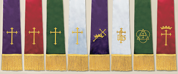 Tailored in a heavy weight, fade resistant Empress (100% polyester) satin this stole is embroidered on both ends of one side with bright gold Latin Crosses and trimmed with matching 4" rayon chainette fringes.