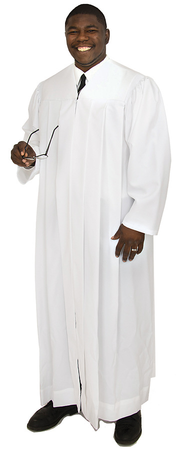 These clergy robes are designed to fit your budget, tailored in soil resistant black Viva fabric and offered in 9 sizes with generous fullness. Construction details include balanced machine fluting over the shoulders and across the back, plus a right pocket slit, a guaranteed nylon zipper closure, and lined bell sleeves with deep cuffs.  Available in black or white.